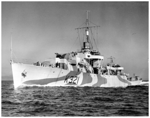 Launched on 3 July 1943, she was commissioned at 1330, 21 January 1944. Her first commanding officer was Acting Lieutenant-Commander E. R. Shaw, RCNR.